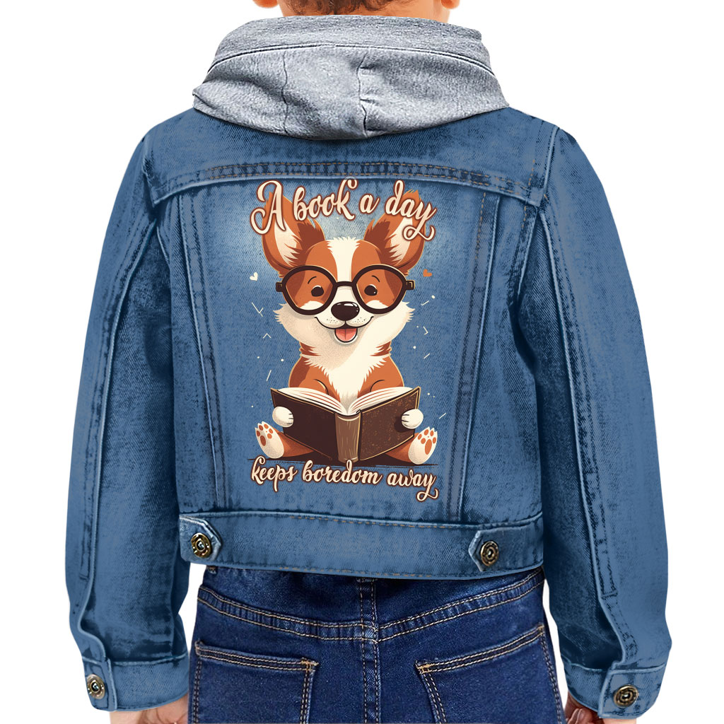 A Book a Day Toddler Hooded Denim Jacket – Corgi Print Jean Jacket – Themed Denim Jacket for Kids